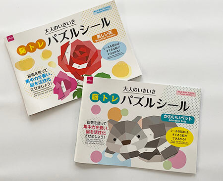 ダイソー 大人のいきいき脳トレパズルシール「大人のいきいき脳トレパズルシール 美しい花」「かわいいペット」(各110円)