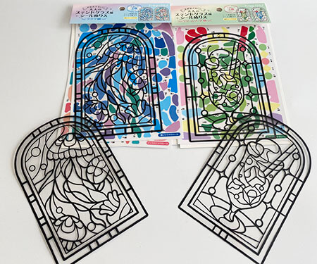 ダイソー ステンドグラス風とうめいシールぬりえ「ステンドグラス風とうめいシールぬりえ」(各110円)
