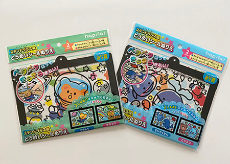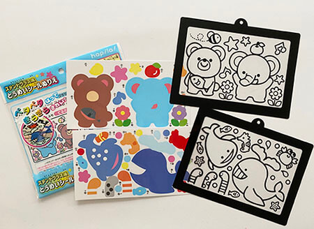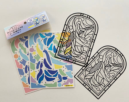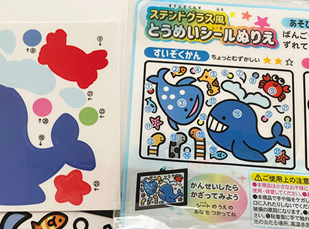 子供向けデザインの”ステンドグラス風とうめいシールぬりえ”はデザインが2種類あり、各2枚づつ入っています、購入した店舗では文具・学童用品コーナーで販売されていました