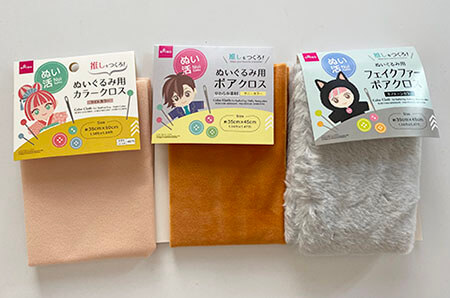 ダイソーではぬいぐるみ用のカラークロス、ボアクロスも販売されているので使用したい色、触り心地のクロスを合わせて購入できます